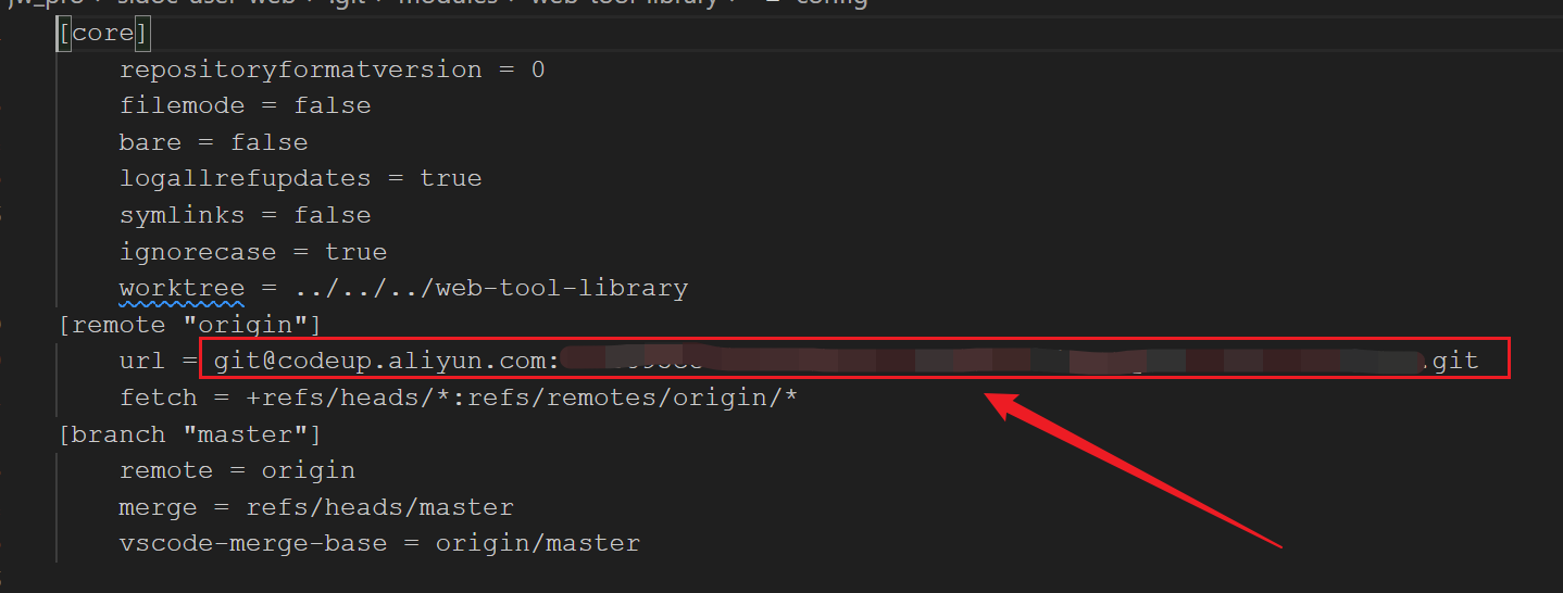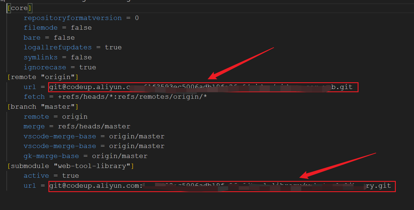 2.在项目根目录下打开 .git/modules/<子项目>/config 文件,修改子仓库的远程地址: