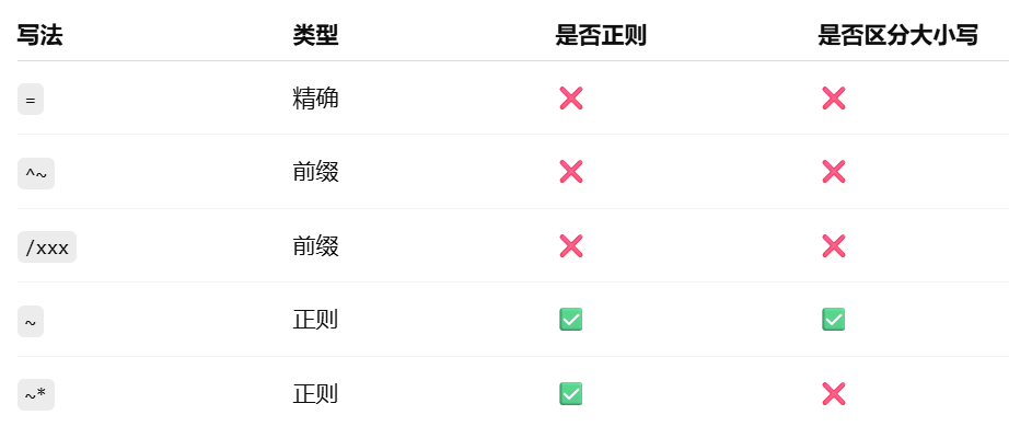 ## last 表示强制重新走一次 location 匹配流程(不推荐使用,容易陷入死循环)