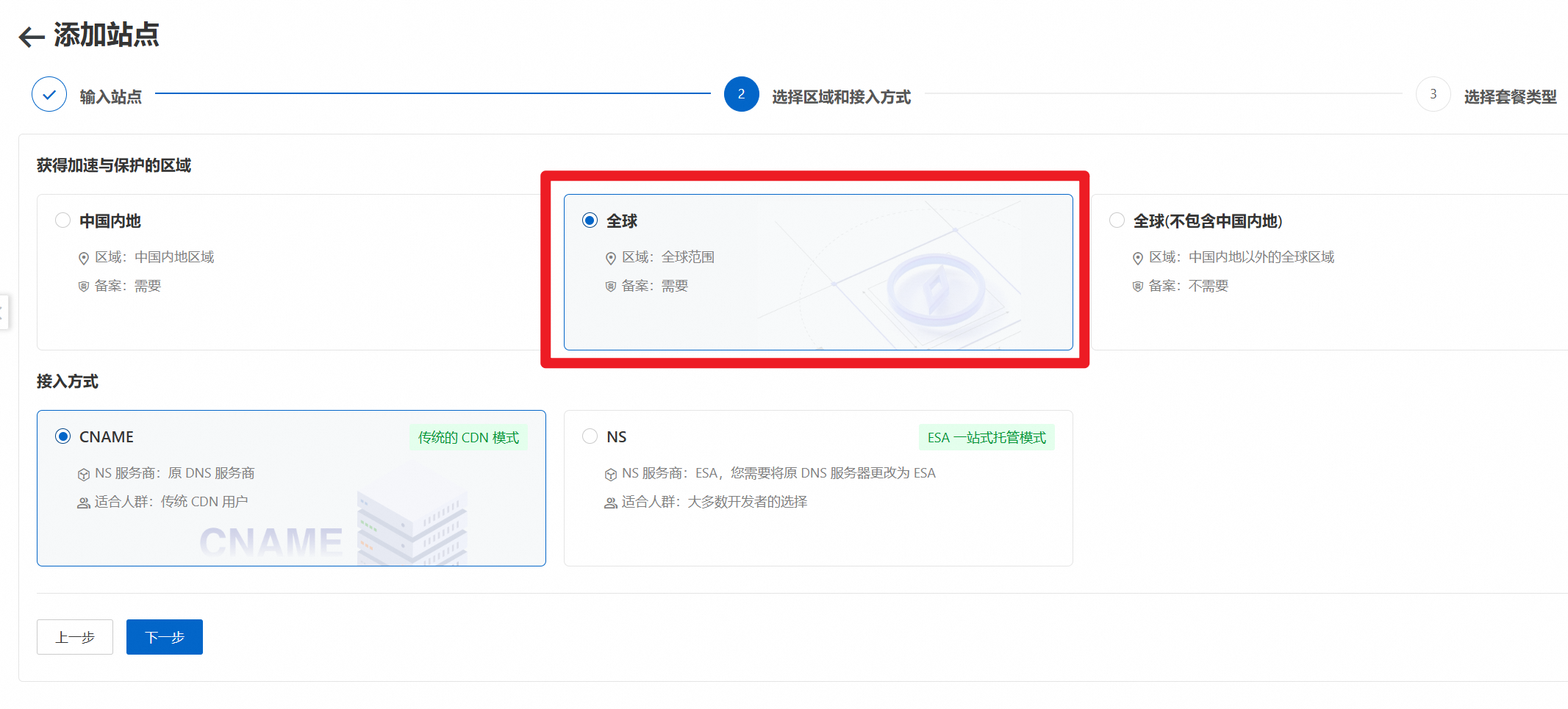 云边缘安全加速ESA 中实现创建站点时选择“全球加速”,如下图所示:
