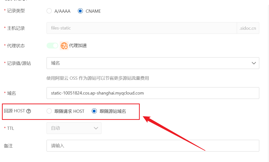 当用户访问CDN域名 files-static.sidoc.cn 时,CDN会请求源站 static-10051824.cos.ap-shanghai.myqcloud.com ;此时就有两种选择,一是CDN回源时转发用户请求中的HOST,也就是使用 files-static.sidoc.cn 作为HOST请求头来访问源站,或跟随源站使用static-10051824.cos.ap-shanghai.myqcloud.com作为访问源站的HOST请求头。