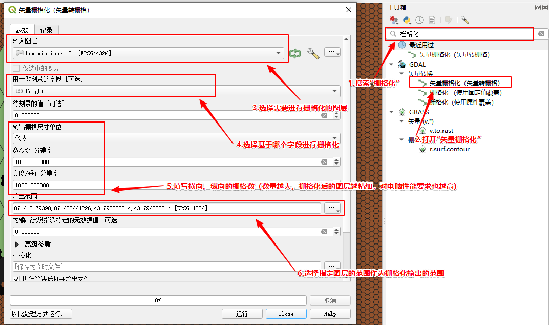 通常情况下,一个矢量图层会有多个属性字段;栅格化是指将其中一个属性的值提取出来重新生成一个tif栅格图层,这个栅格图层类似dem图层,只表示一种信息。如下图,是从矢量图层中提取某个属性生成的栅格图层。这种单一信息的栅格图层通常用于数据分析等场景;例如:分区统计面积等。