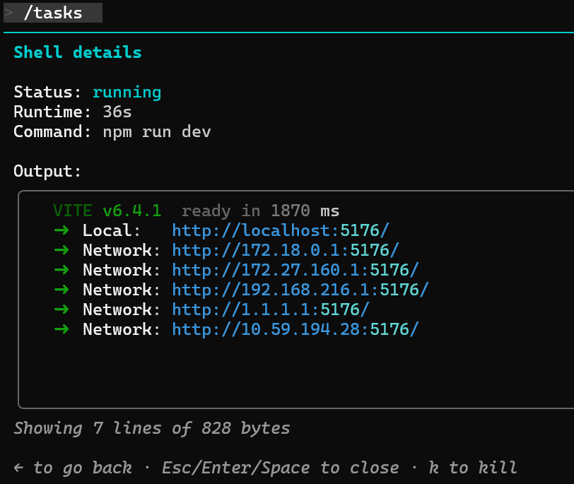 输入命令 /tasks 可查看当前正在运行的后台任务;如下图下方,按 Esc/Enter/Space 可退出任务任务查看,按 k 可直接杀死这个任务;