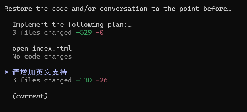 注:不能太依赖 claude code 的回滚功能,因为 claude code 只能回滚自己修改或创建的文件;由终端命令创建的文件 claude code 不会回滚;例如,通过 npm install 安装依赖时创建的文件是不会回滚的;因此,最好使用 git 进行回滚或代码历史管理。