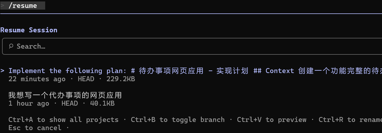 如果退出了对话,可通过 /resume 命令来恢复到之前的某个会话,如下图: