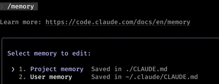 可以通过任何编辑器来修改 claude.md ,也可以通过命令 /memery 命令直接打开 claude.md ,如下图: