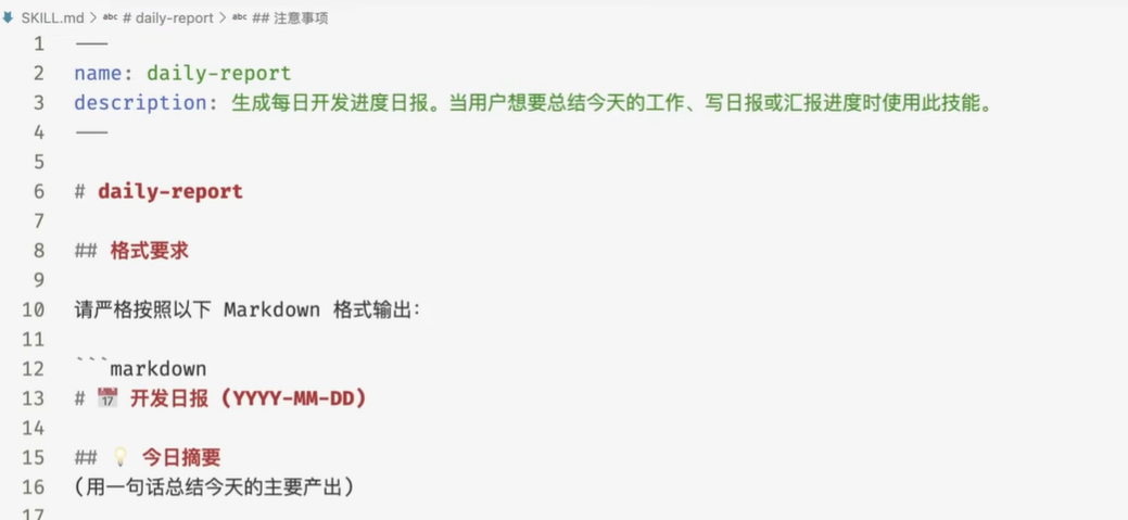 Agent Skill(代理技能)是指 Claude 可以主动调用的一组预定义工具、函数、规则或提示词。每个 skills 都有自己的名称和描述,AI 模型在工作过程中按需使用特定的 skills。可以在 .claude/skills/ 或 ~/.claude/skills/ 目录下创建隶属于当前项目或系统用户级别的 skills;推荐为每个 skills 技能都创建一个文件夹,因为一个 skills 技能可能是由多个 skills 文件以树形结构组成。skills 内容格式如下: