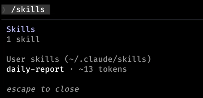 如下图,通过 /skills 命令可查看当前已生效的 skills,通常情况下创建后需要退出重新进入 claude code;
