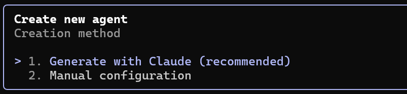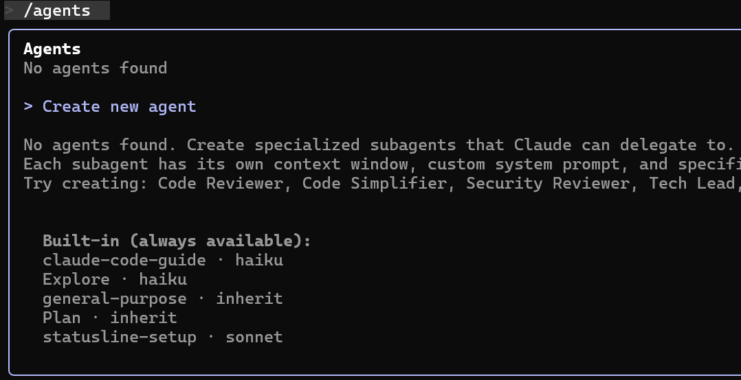 a> 使用 /agents 命令管理 agent ;如下图,没有 agent,则选择创建新的 agent;