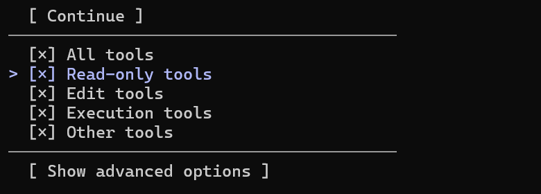 [x] Read-only tools 表示只读工具。Agent 只能查看文件结构、读取文件内容、分析代码,不能修改任何文件或运行命令。
