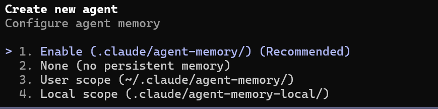 Enable (.claude/agent-memory/): 允许在当前项目中持久化记忆,这是推荐设置。