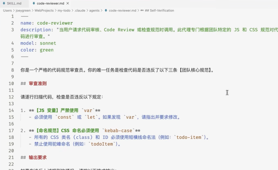 SubAgent(子代理)是一种将复杂任务拆解并分配给专门的“任务专员”来执行的机制。例如,要让 AI 模型执行一个审核代码的任务,这种任务与当前上下文没有任何关联,它是一个完全独立、运行后立即结束的任务;如果将这样的任务放在当前会话上下文中执行,会严重污染当前上下文,导致当前上下文充斥着大量无用、冗余的内容;因此,这种任务就特别适合交给 SubAgent 来执行,SubAgent 有自己独立的上下文、独立的工具、独立的 skills,不会污染当前上下文。SubAgent 与 skills 的写法、作用完全相同,区别就是 skills 在当前上下文中执行,而 SubAgent 在自己独立的上下文中执行。