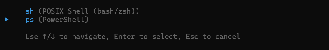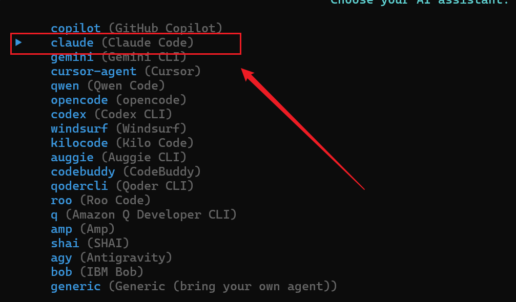 初始化 spec-kit 项目时会提示要使用 AI 工具和命令行工具;此处选择 claude code 作为 AI 助手工具,Window下选择 PowerShell 作为命令行工具,如下: