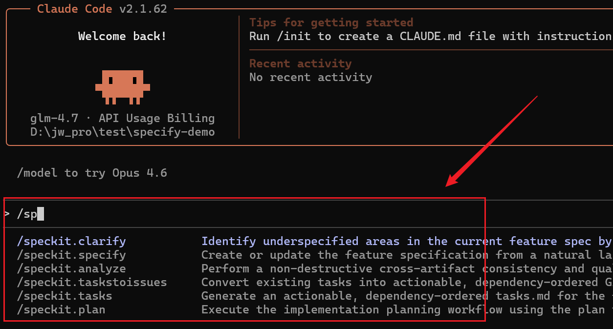 在 spec-kit 项目目录中打开 AI 工具,然后就能看到 spec-kit 相关的命令,如下图: